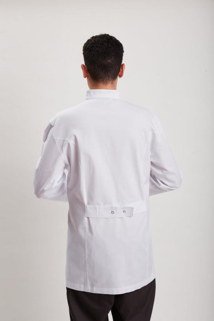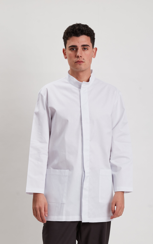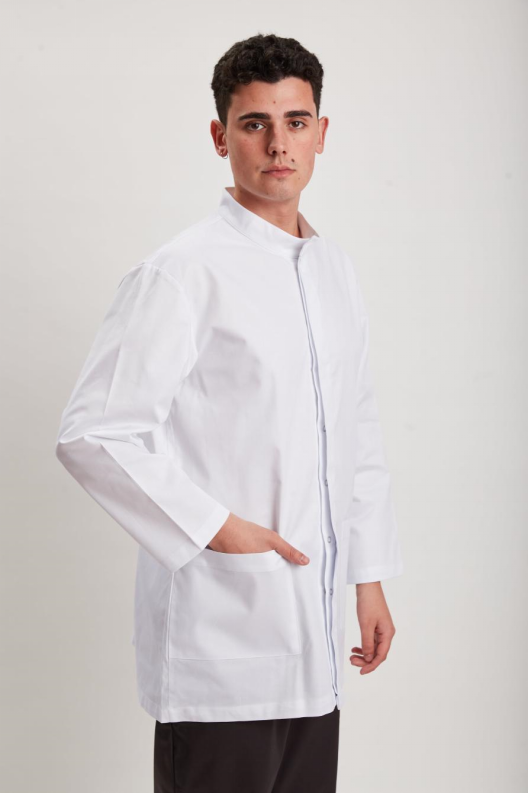 Bata para hombre manga larga con cuello mao y dos bolsillos. Su botonadura oculta con tapeta y cierre de automáticos ofrece un frontal limpio y funcional. Confeccionado en tejido 100% algodón que ofrece confort y facilidad de movimiento durante la jornada laboral. Cuidados: Lavar 30° máximo ciclo suave No usar ningún tipo de blanqueador Planchar a temperatura media Limpieza en seco (No tricloroestileno) Secar a baja temperatura