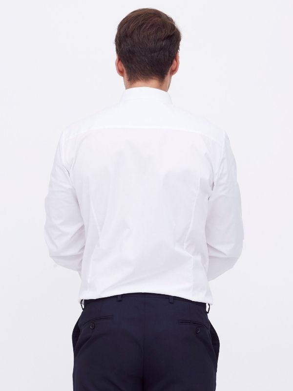 Camisa lisa, confeccionada en una suave mezcla de algodón 97% y elastán 3%, que aporta comodidad y libertad de movimiento. Diseñada con nuestro patrón Slim Fit, que realza la silueta. Presenta cuello mao, cierre mediante botonadura frontal y manga larga acabada en puño sesgado con cierre de un botón.