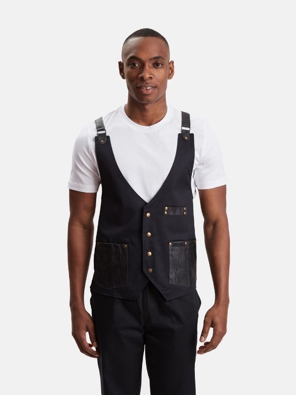 La parte trasera presenta un sistema de tirantes cruzados en polipiel, unidos mediante una pieza octogonal central reforzada. Estos tirantes rodean los hombros y el torso, y se ajustan lateralmente mediante hebillas metálicas, proporcionando sujeción y un ajuste regulable. Prenda diseñada para ofrecer estilo y comodidad en entornos de coctelería o servicio profesional.