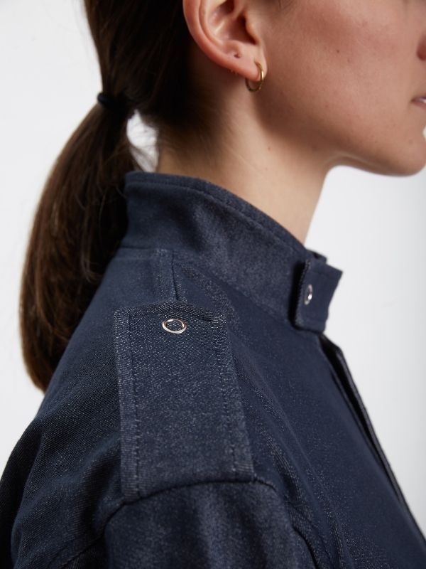 Cuenta con cuello mao con solapa y automático visible, cierre delantero con automáticos metálicos, y galones en los hombros fijados con automáticos que permiten apertura. La espalda con costadillo francés, prolongada hasta la costura trasera de la manga, aporta estructura y continuidad al patrón.