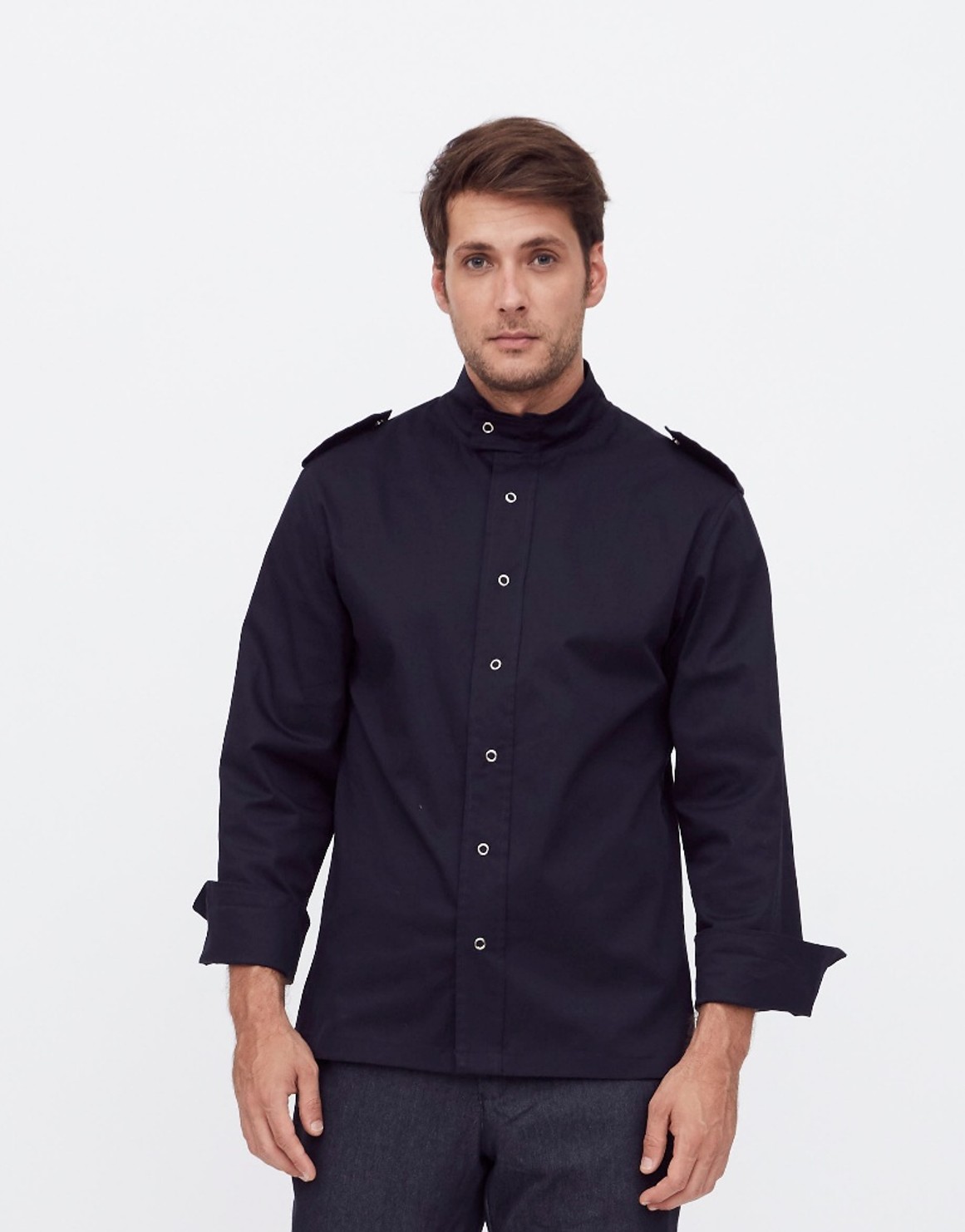 Diseño con cuello mao que se une mediante una solapa con automático visible, aportando un cierre seguro con un detalle distintivo. El delantero se cierra con automáticos metálicos visibles. Presenta galones en los hombros, fijados con automáticos metálicos, que permiten su apertura.