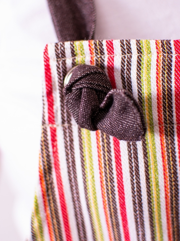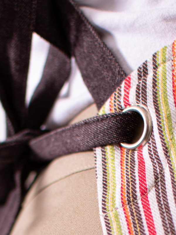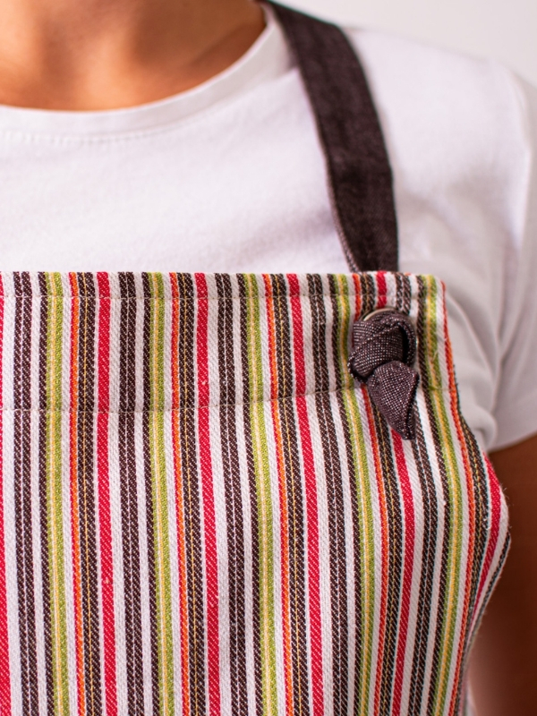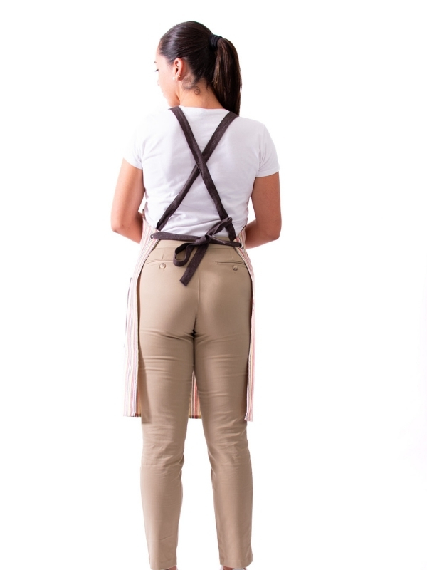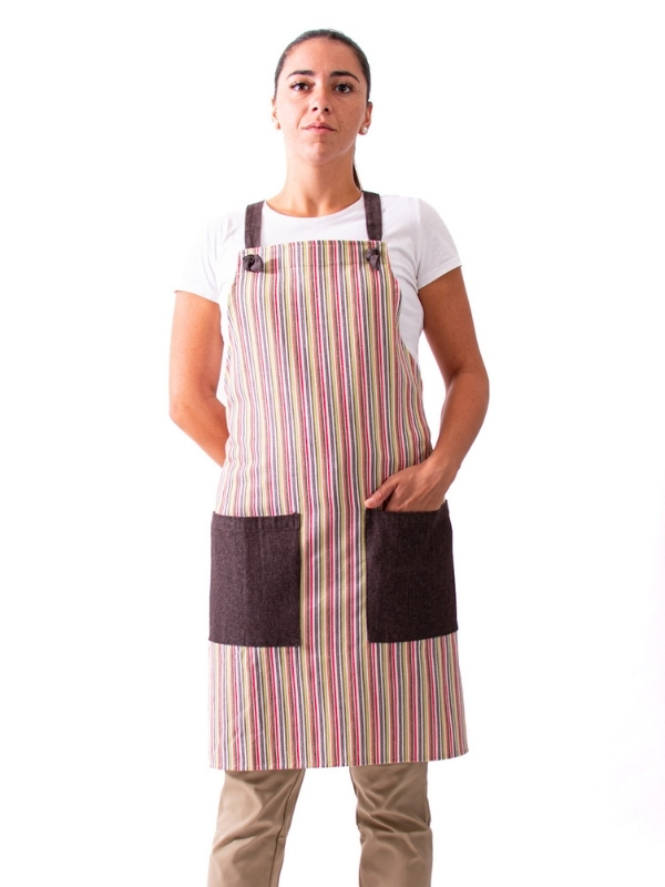 Peto Rayas Jeans, confeccionado en un tejido de 80 % algodón y 20 % poliéster, que combina suavidad, resistencia y confort. Su diseño incorpora un original sistema de ajuste mediante nudos, además de una divertida combinación de líneas de colores sobre base denim, aportando un estilo moderno y desenfadado sin perder profesionalidad. Disponible en talla única, con un largo de 83 cm, ancho de 66 cm y espalda cruzada, ofrece una cobertura cómoda y libertad de movimiento. Una prenda versátil, práctica y con personalidad, perfecta para quienes buscan destacar con un toque de color y estilo propio.